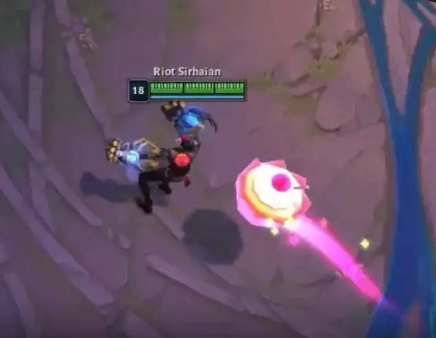 此外,魄罗王每秒会跃向空中并猛砸地面,对附近敌人造成 100-300(+5% 额外生命值)(+100% 基础攻击力)(+50% 法术强度)的物理伤害并将其击退。每次施法,魄罗王无法对同一敌人多次造成击退效果。