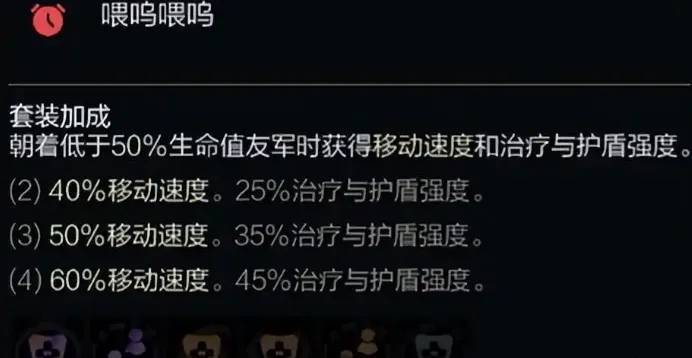 羁绊加成:朝着生命值低于50%的友军移动时获得移动速度,治疗和护盾效果加成。