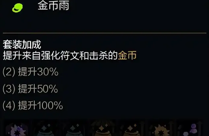 套装加成:提升来自强化符文和击杀的金币