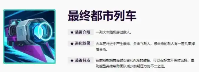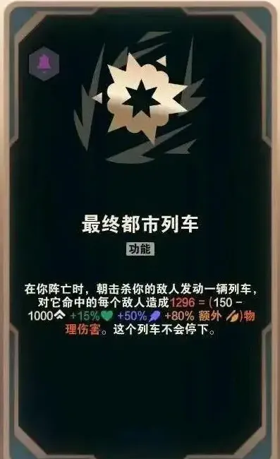 · 最终都市列车:你阵亡后,将向击杀者发射一列火车,对命中的敌人造成 150-1000(+80% 基础攻击力)(+50% 法术强度)(+15% 最大生命值)的物理伤害。(注:该效果将记录造成的伤害量、命中英雄次数及击杀英雄数量。)