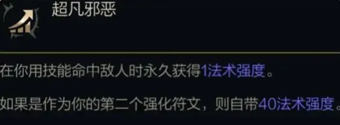 · 超凡邪恶:使用技能命中敌人后,永久获得1点法术强度。若该强化符文为你的第二个选择,将初始自带40点法术强度。